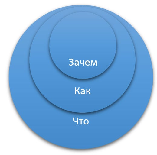 Любой человек, любая организация на земле знают, что они делают. 100% некоторые знают - как они это делают. Это может называться дифференцированным предложением ценности или оригинальным процессом. Но очень, очень немногие люди или организации знают - зачем они делают то, что они делают. И под «зачем» не имеется в виду «чтобы получить прибыль». Это результат. Под «зачем» имеется в виду: какова твоя цель? Какова твоя причина? Во что ты веришь? Зачем существует ваша организация? Что мотивирует вас вставать с кровати по утрам? И почему это должно кого-то волновать? В результате, то, как мы мыслим, то, как мы действуем, как мы общаемся — это процесс, направленный снаружи вовнутрь.