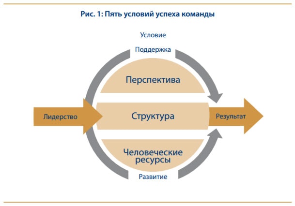 Хэкменом и Уэйгмен выяснили, что существует пять условий для успеха команды. Эти пять условий включают: структуру, человеческие ресурсы, поддержку и развитие (см. рисунок 1).